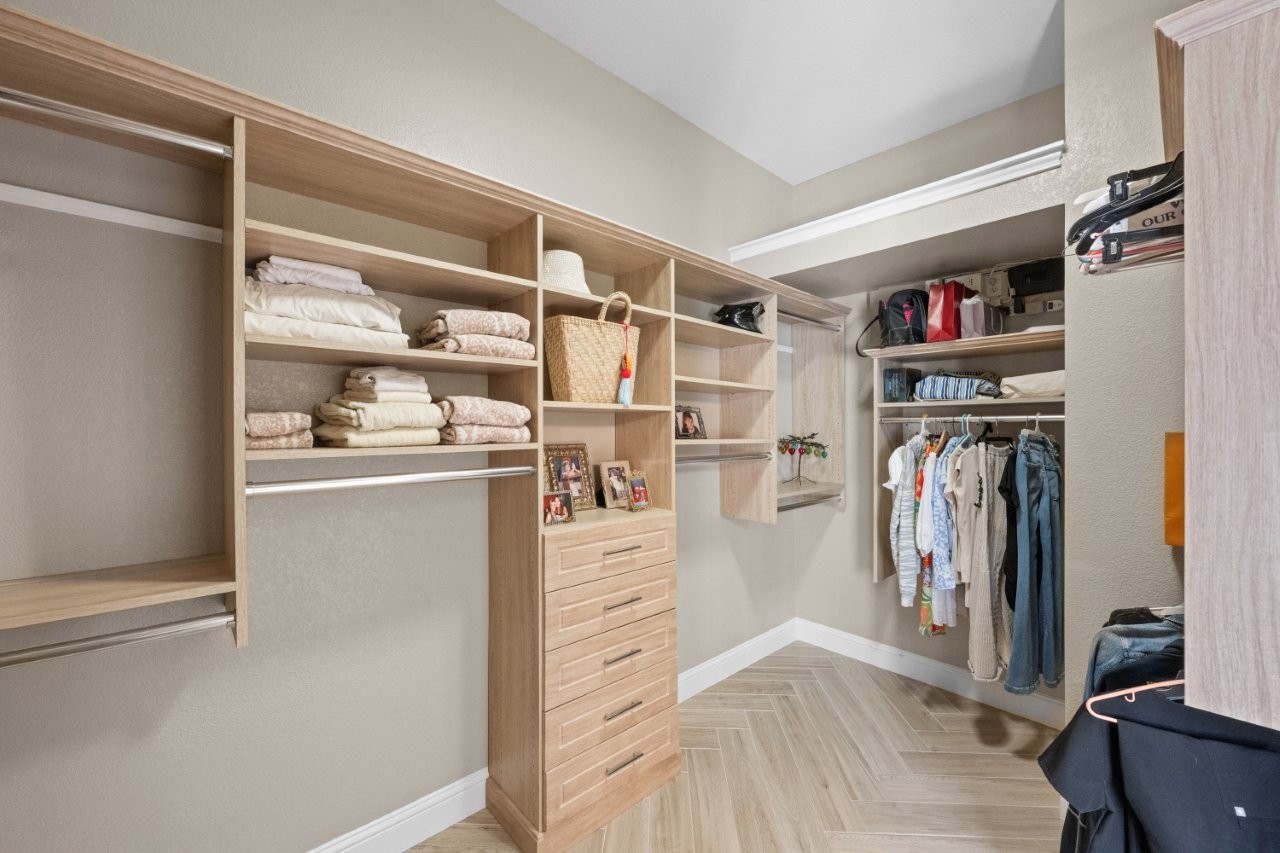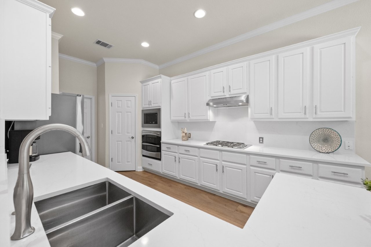 This meticulously updated single-story, stand-alone condominium is located in a private, gated community. The home features a chef’s kitchen with quartz countertops, stainless steel appliances, a KitchenAid gas cooktop, double ovens, and a walk-in pantry, opening to a spacious living area with two dining spaces. Wide-plank White Oak hardwood floors run throughout the living areas and bedrooms, and Restoration Hardware chandeliers add clean, modern finishes.